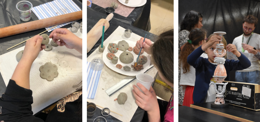 En 2024-2025, nous avons travaillé avec une classe de primaire de CE2-CM1-CM2 de Mayenne et la céramiste Anne Corre sur le thème de la poterie et de la lumière. Après une visite guidée du musée, à la découverte des collections, les élèves se sont initiés à l’art de la poterie. Anne Corre est intervenue en classe pour des ateliers pratique. Sur plusieurs séances, la classe a modelé des bougeoirs, dont les motifs ressemblaient étrangement aux objets exposés au musée … La restitution lors de la Nuit européenne des musées le 17 mai 2025 a mis en lumière les œuvres créées par les élèves, qui ont pu expliquer leur travail aux visiteurs.
